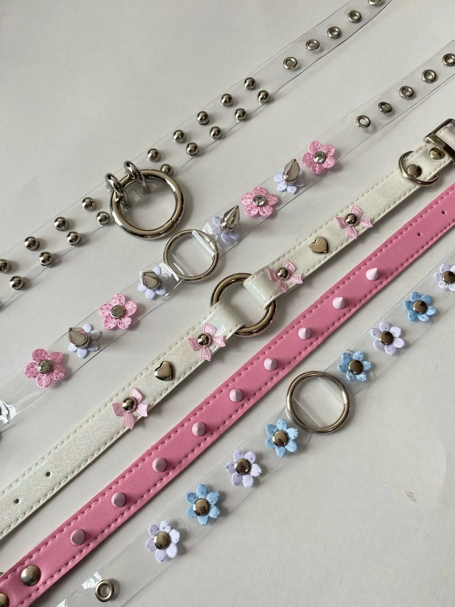 Choker blanco tornasol de aro con lazos y remaches de corazón.
