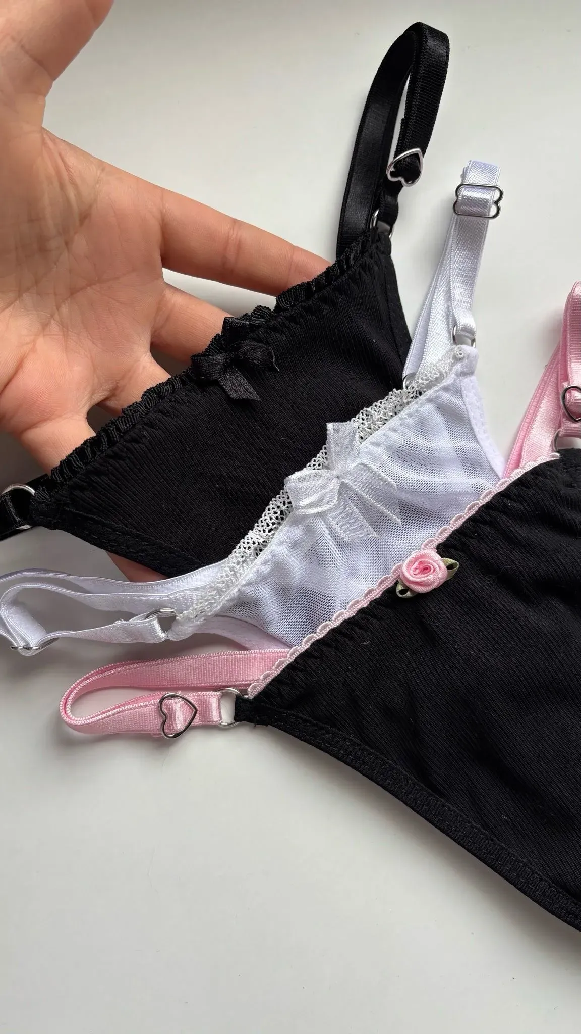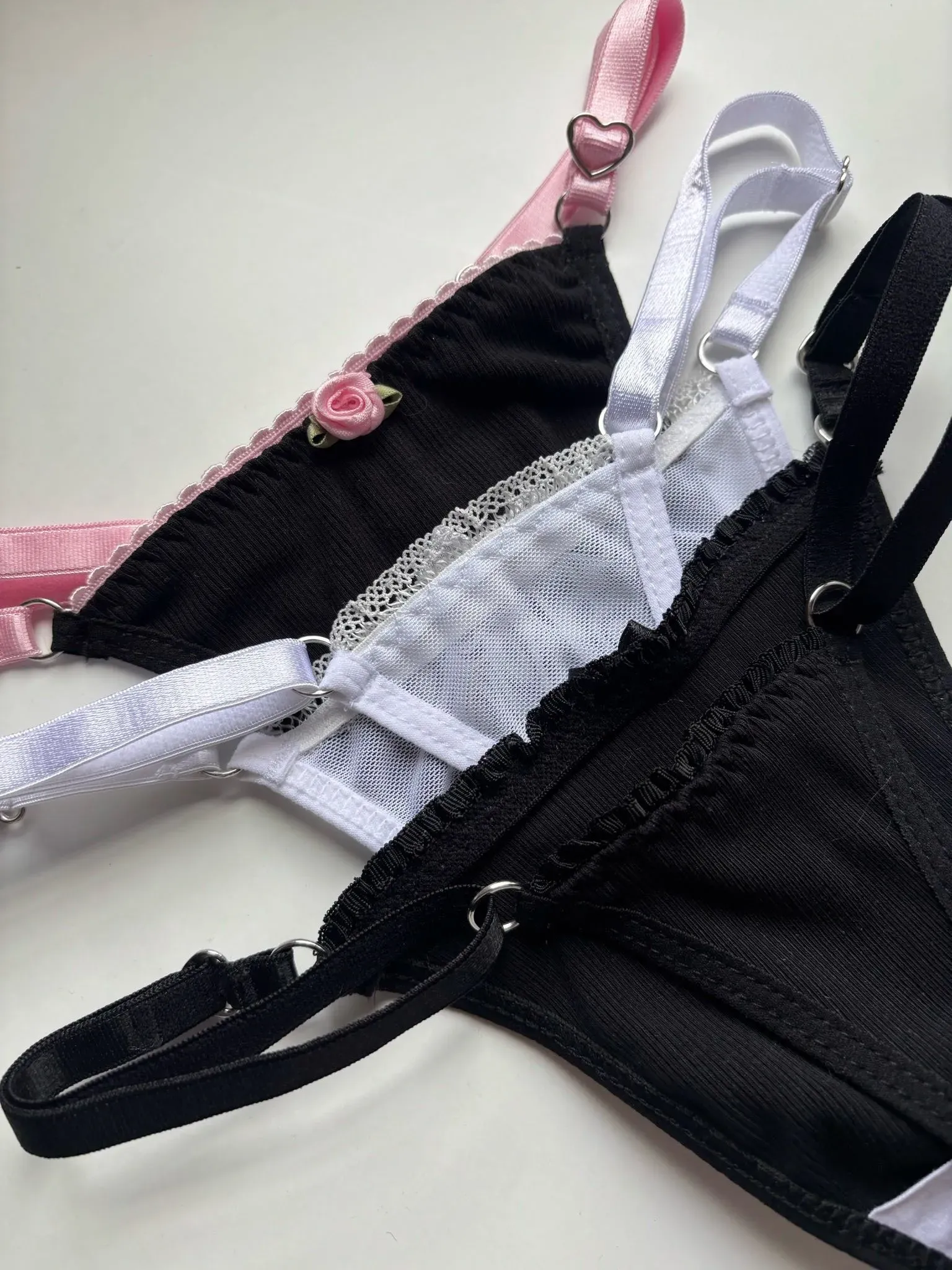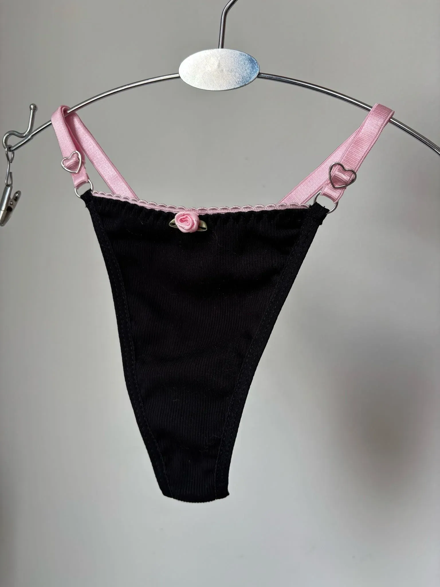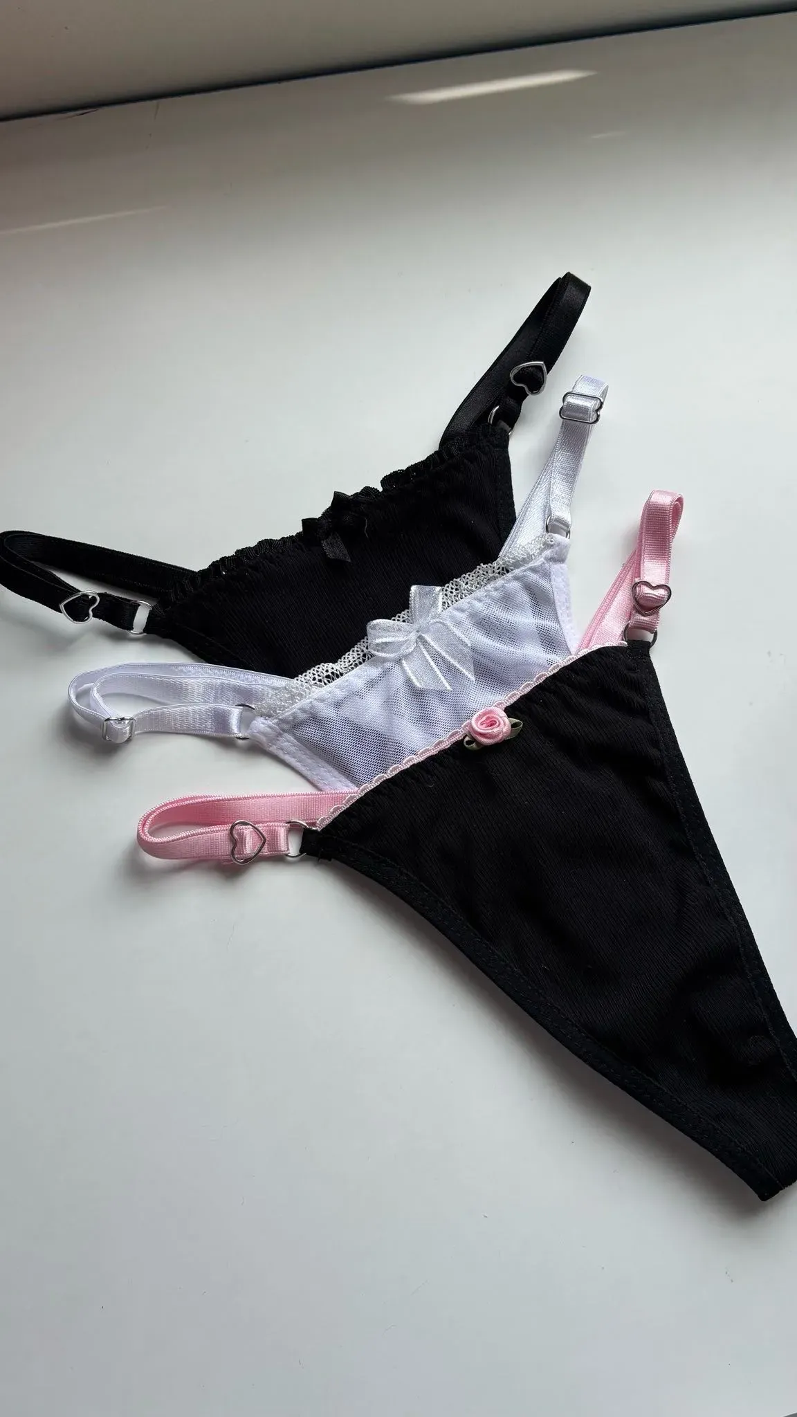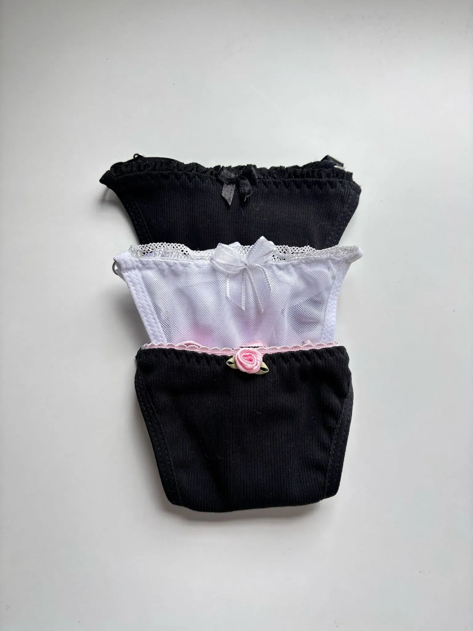 Pack de tangas en una combinación clásica de negro, blanco y rosa.