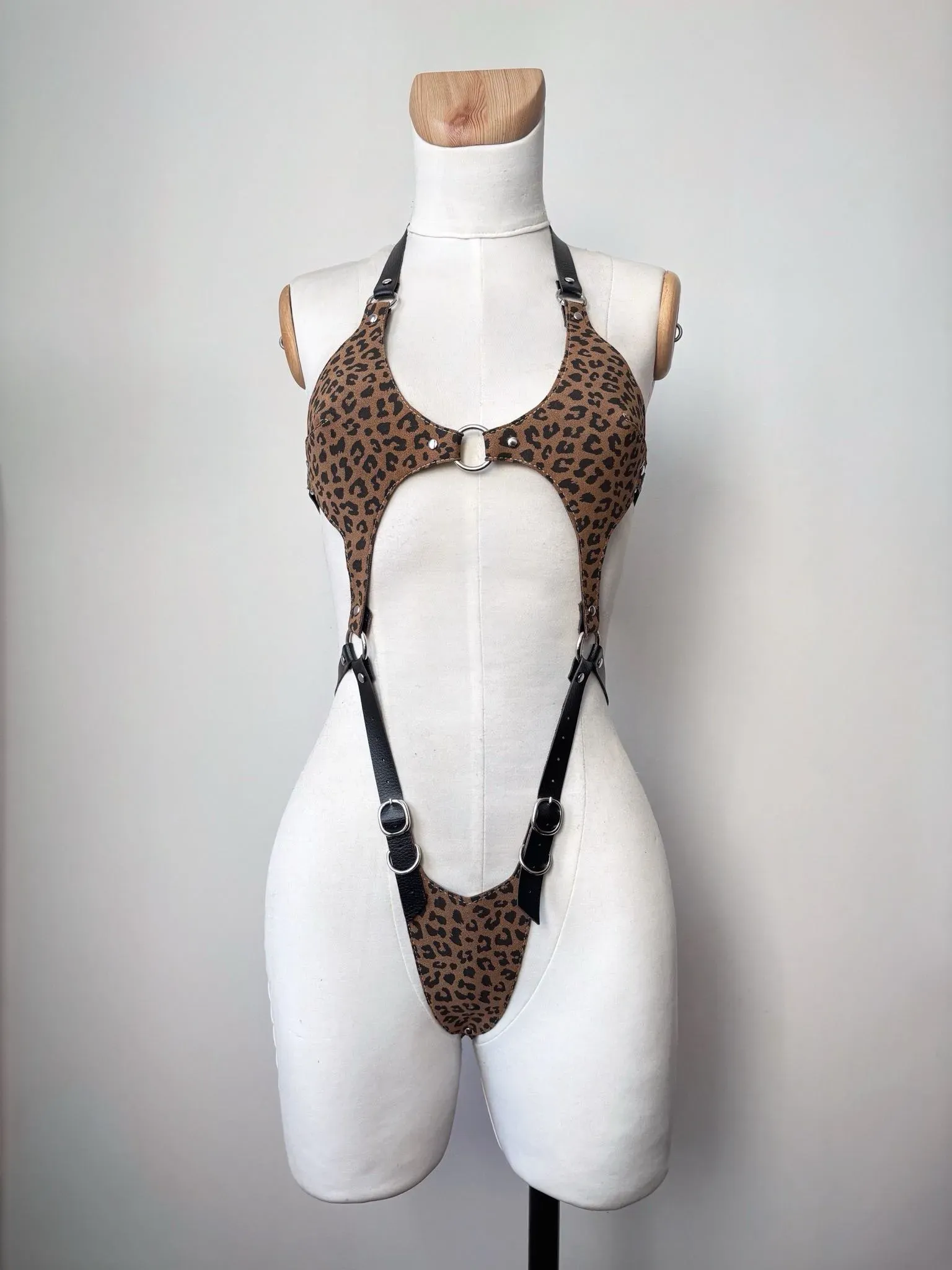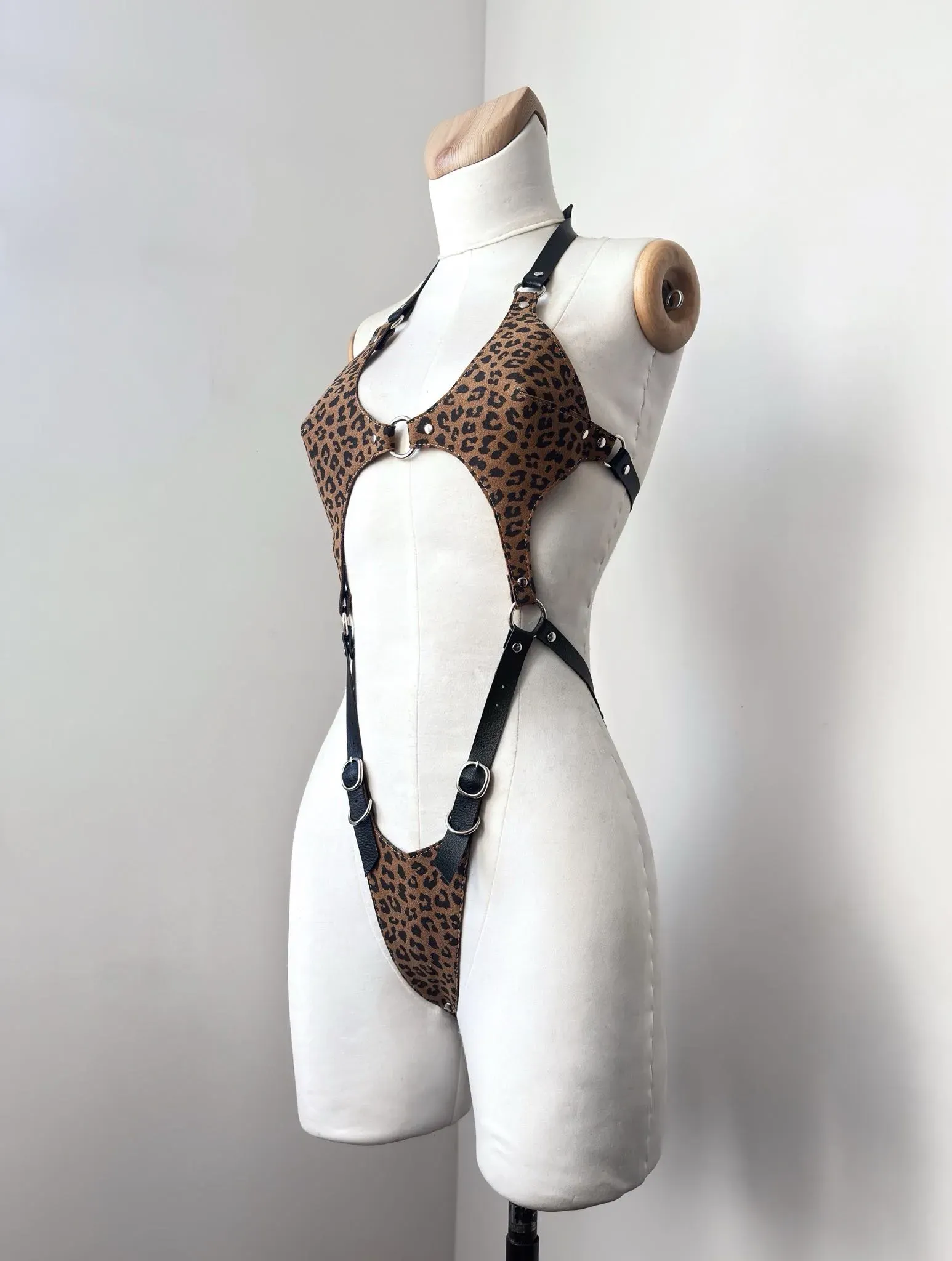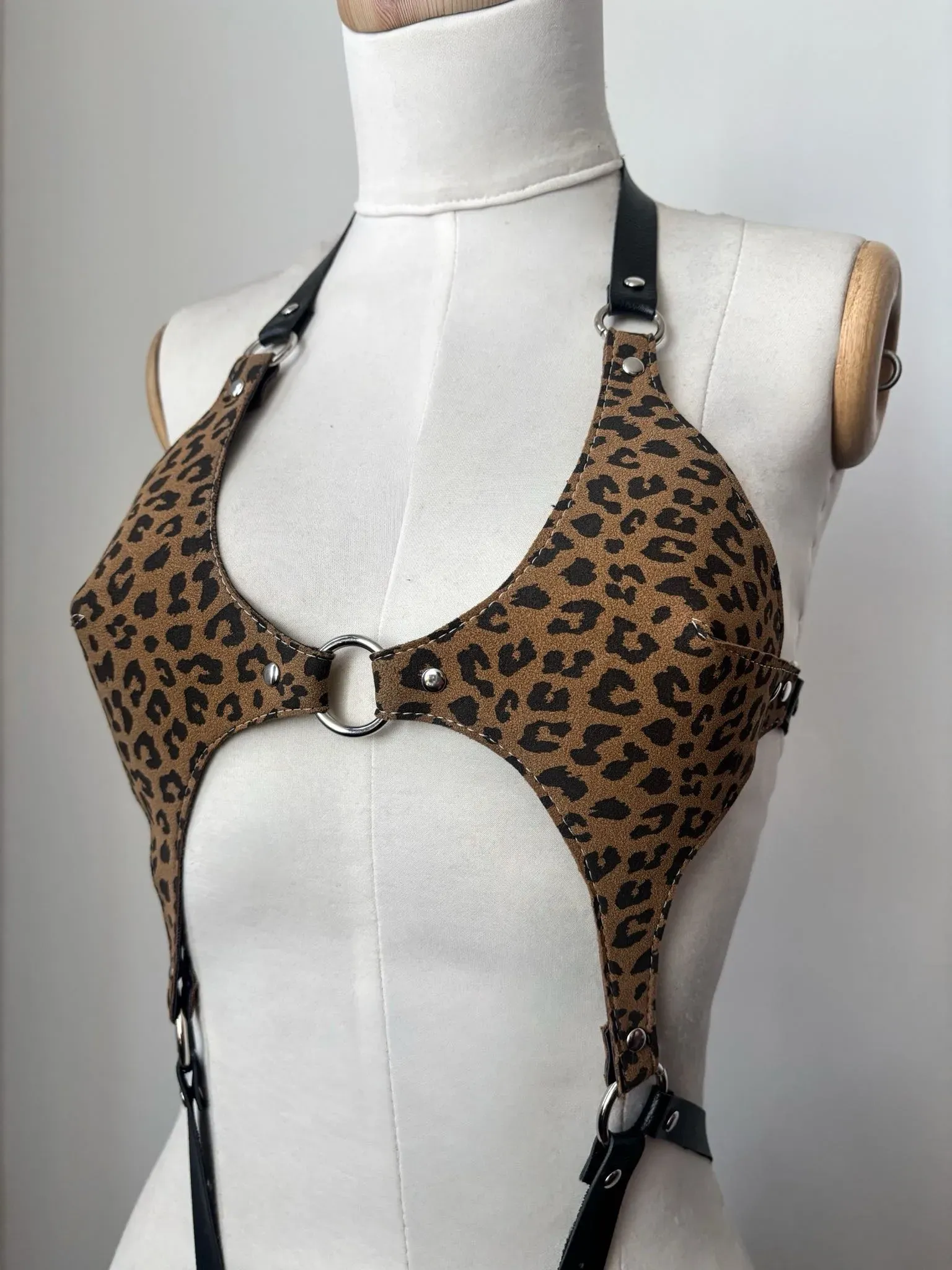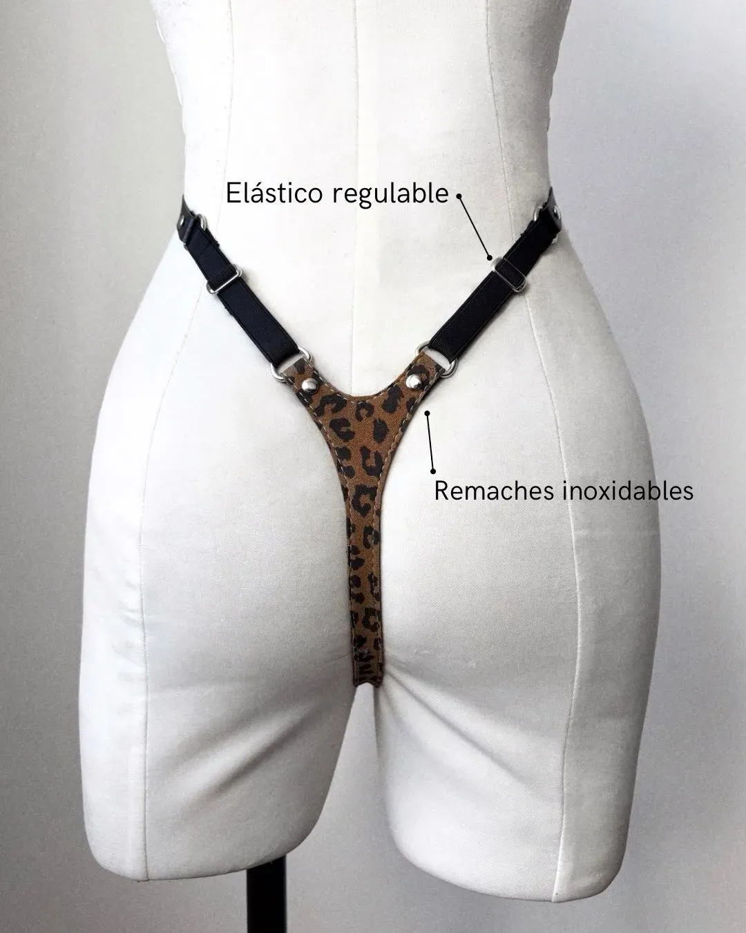 Una pieza estructural elaborada en textil animal print y sintético negro. Remaches de acero inoxidable.