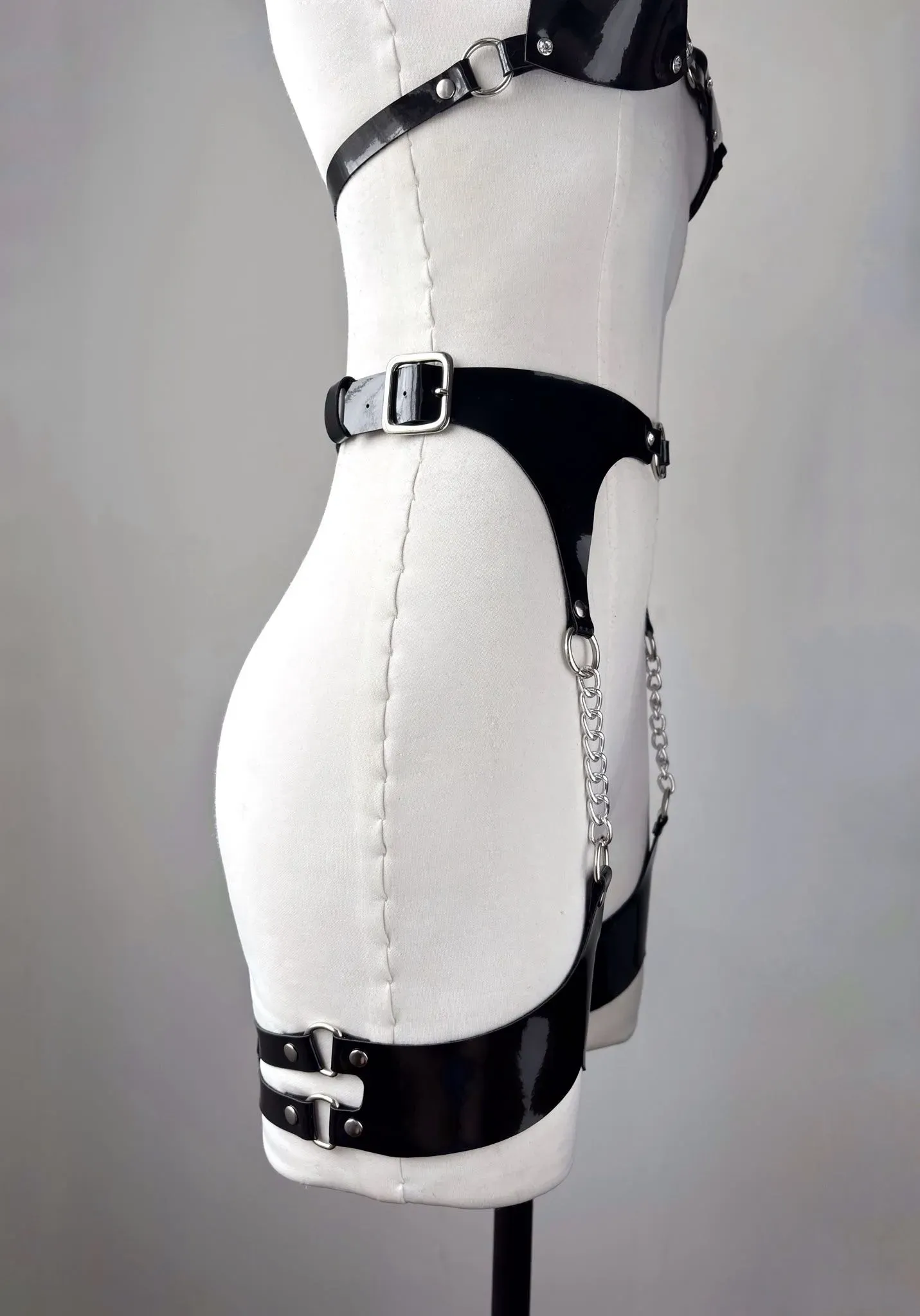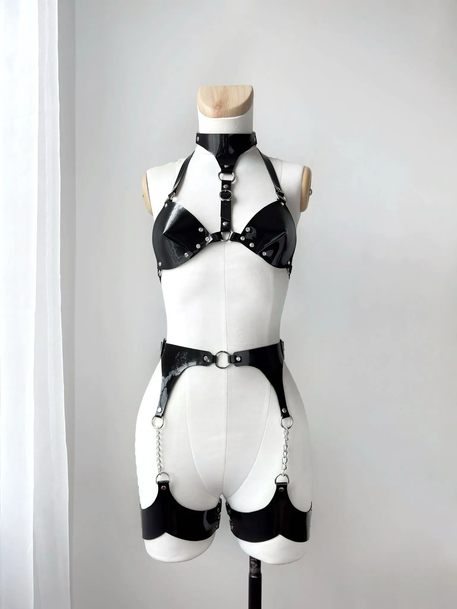 El set está elaborado en sintético charol negro de alta calidad: un material resistente, con acabado brillante tipo vinilo, que aporta una estética atrevida y elegante a la vez.